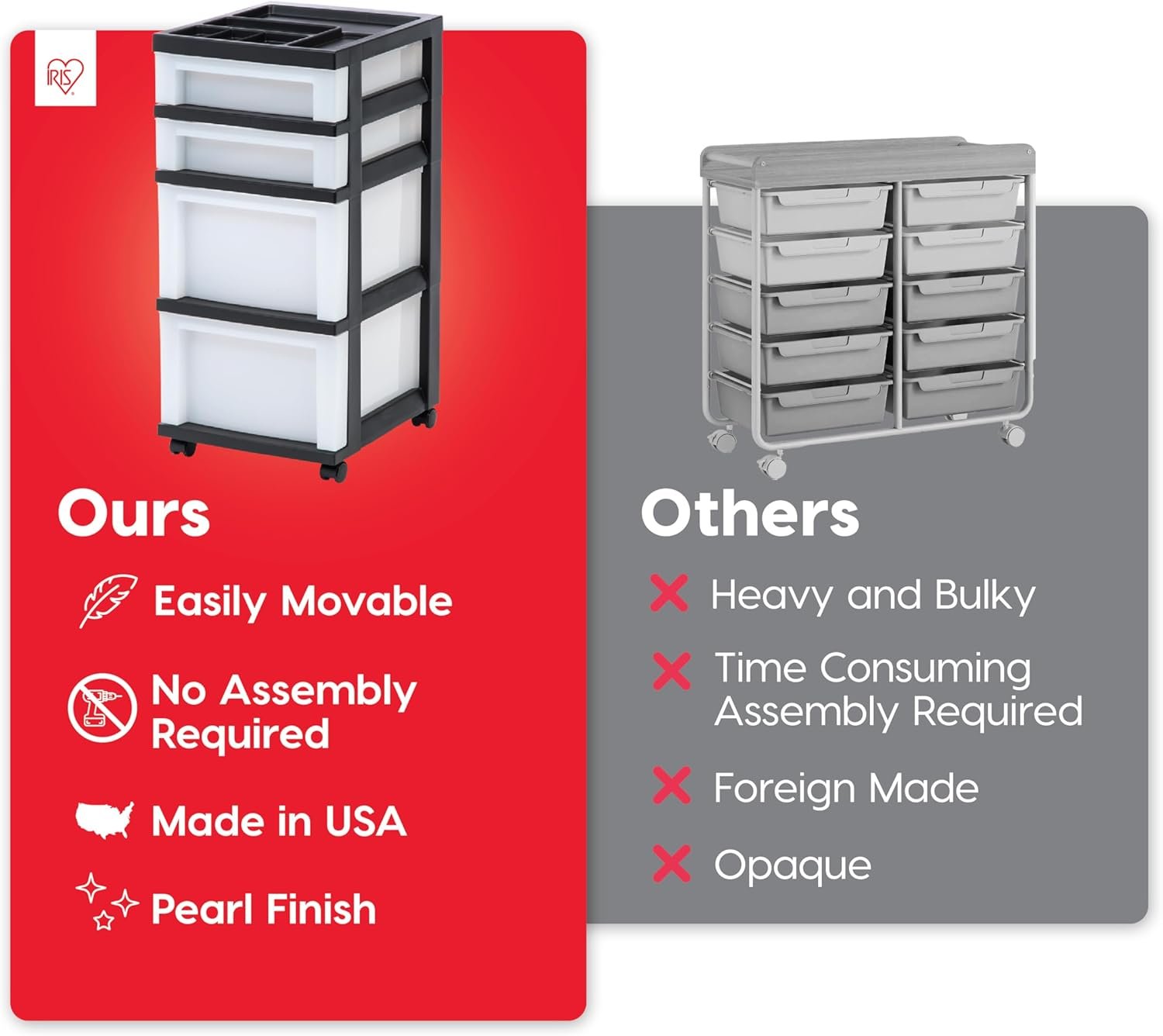 Compared to other plastic storage carts—like the Sterilite 3-Drawer Wide Cart and Honey-Can-Do Rolling Storage Organizer—this product stands out for its excellent value, flexible caster options, and drawer-stopping safety feature. The IRIS USA model is lighter and easier to assemble, but its plastic walls are thinner than premium rivals, making it less suited for heavy-duty applications.