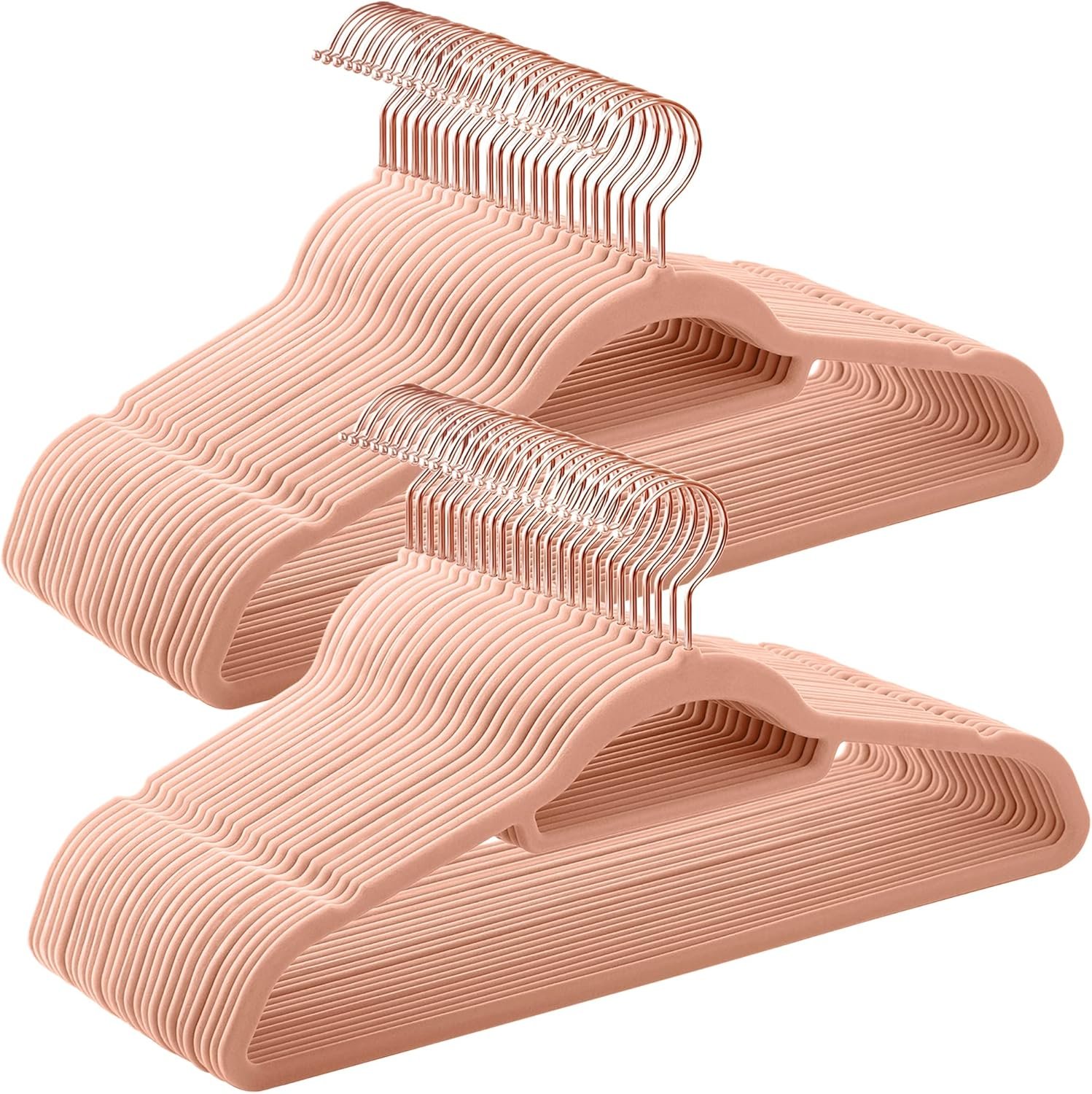 Upgrade your closet with the SONGMICS Velvet Hangers, a set of 50 stylish and space-saving clothes hangers featuring a sleek coral pink finish and elegant rose gold swivel hooks. These slim yet sturdy hangers prevent clothes from slipping or wrinkling, thanks to their non-slip velvet surface and convenient notches for camisoles or strappy tops. Built to hold up to 11 lbs each, they’re perfect for everything from lightweight shirts to heavy coats, while the slim 0.2-inch profile maximizes your wardrobe space. Organize your clothes in style and keep your closet neat with this reliable and attractive solution from SONGMICS!